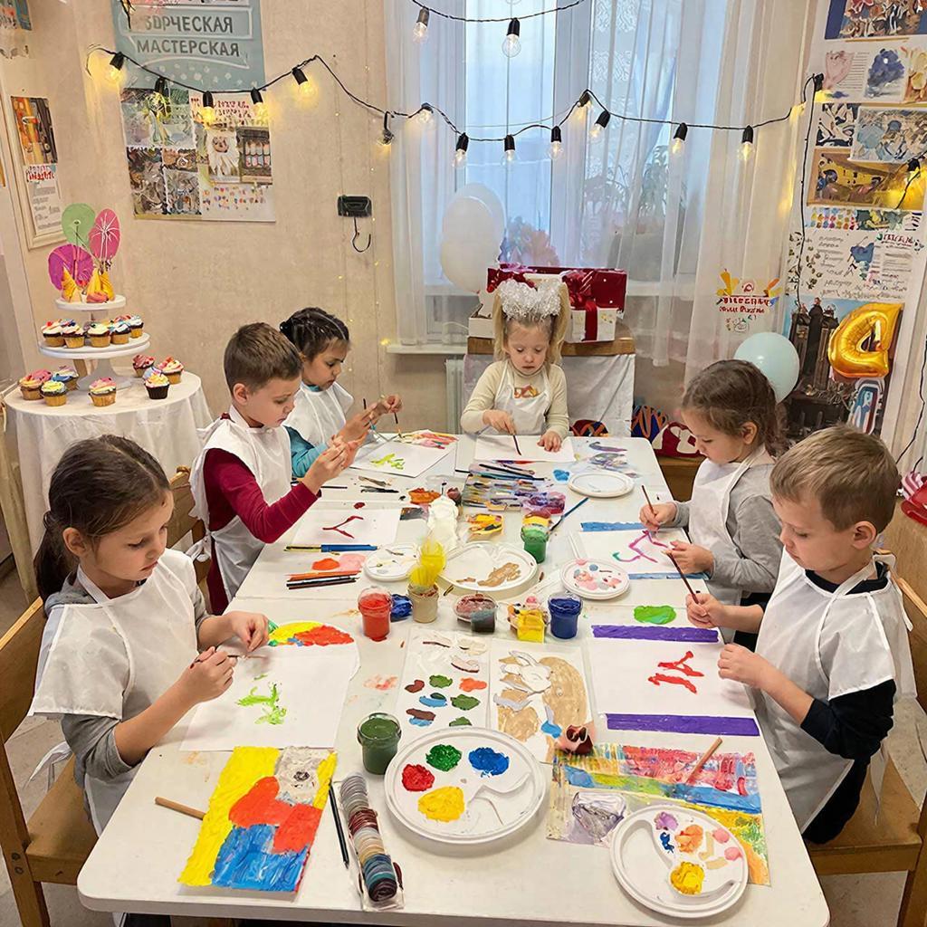 - Праздник дома. Этот вариант позволяет создать более уютную атмосферу и пригласить больше гостей (в студиях часто есть ограничения по количеству). Однако он требует тщательной подготовки: нужно защитить мебель и пол от краски (плёнкой или газетами), подготовить рабочие места для каждого ребёнка и заранее закупить все расходные материалы.